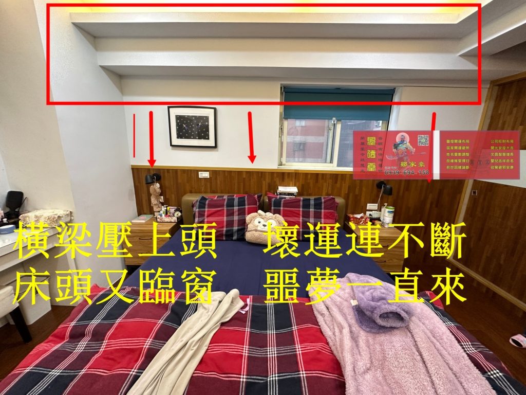 問題本質​:梁為房屋「硬煞」,床體正上方有梁,易引「頭痛、失眠、精神壓抑」,長期睡壓頂煞者,事業運易受阻(象徵「頭頂有壓力」)。
